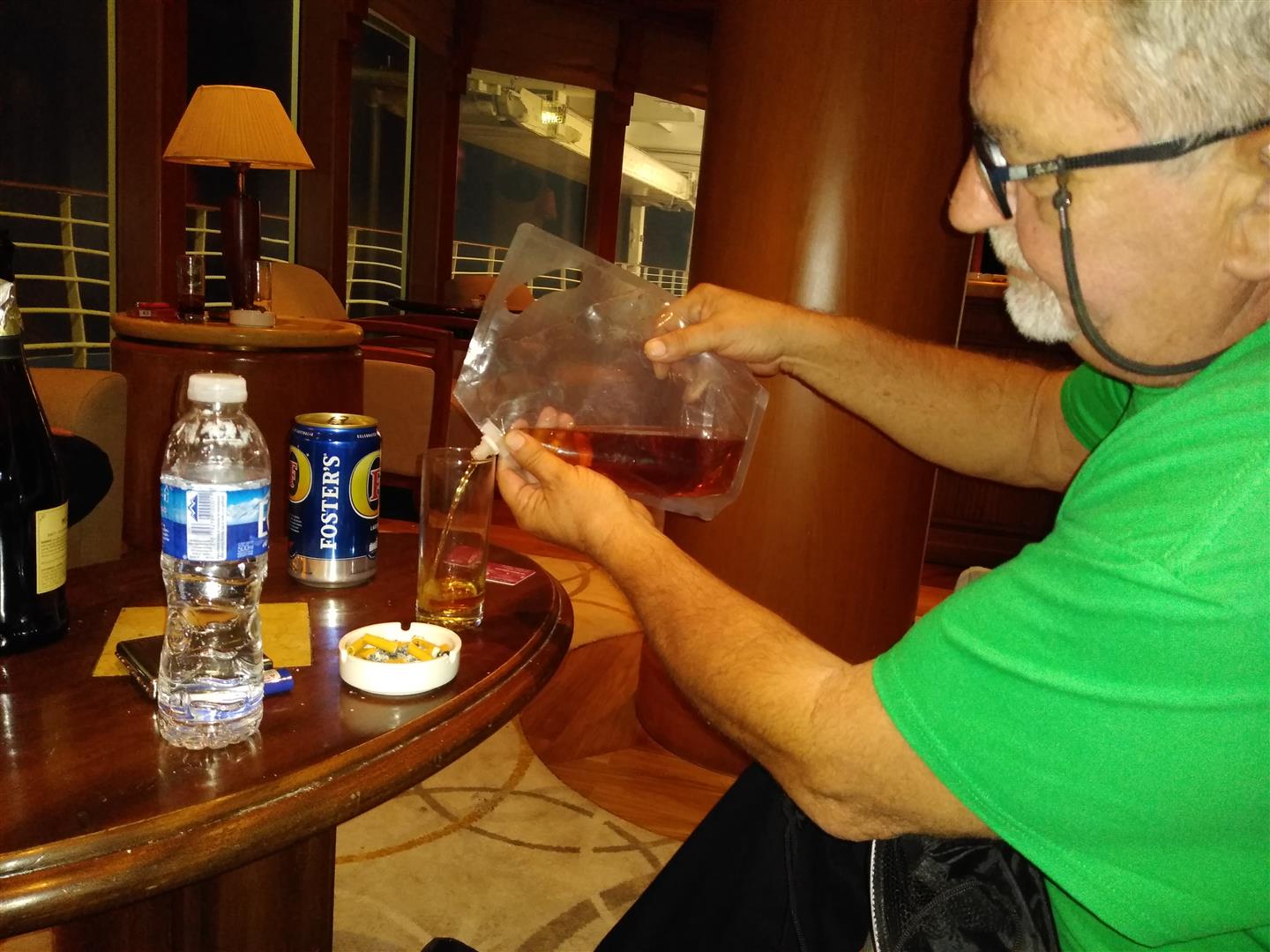 A 16 day cruise can get a little expensive if you like your drinks. A beer is $6.75 and a whisky and soda over $10, while a glass of wine runs at $9.00. So to deflect these expenses you HAVE to smuggle booze on board, and this is best done with professional smuggling equipment freely available from Amazon specifically for the purpose of cruising (who knew this was an actually industry - building products whose only purpose is to get cheap booze onto a cruise ship) Rum Runner's clear bladders work every time! Here is yours truly pouring a drink from my Rum Runner bladder. They ALWAYS get through X-ray. I stocked up again in Ushuaia - very cheap - 1 liter bottle of decent whisky was only $7.00! |