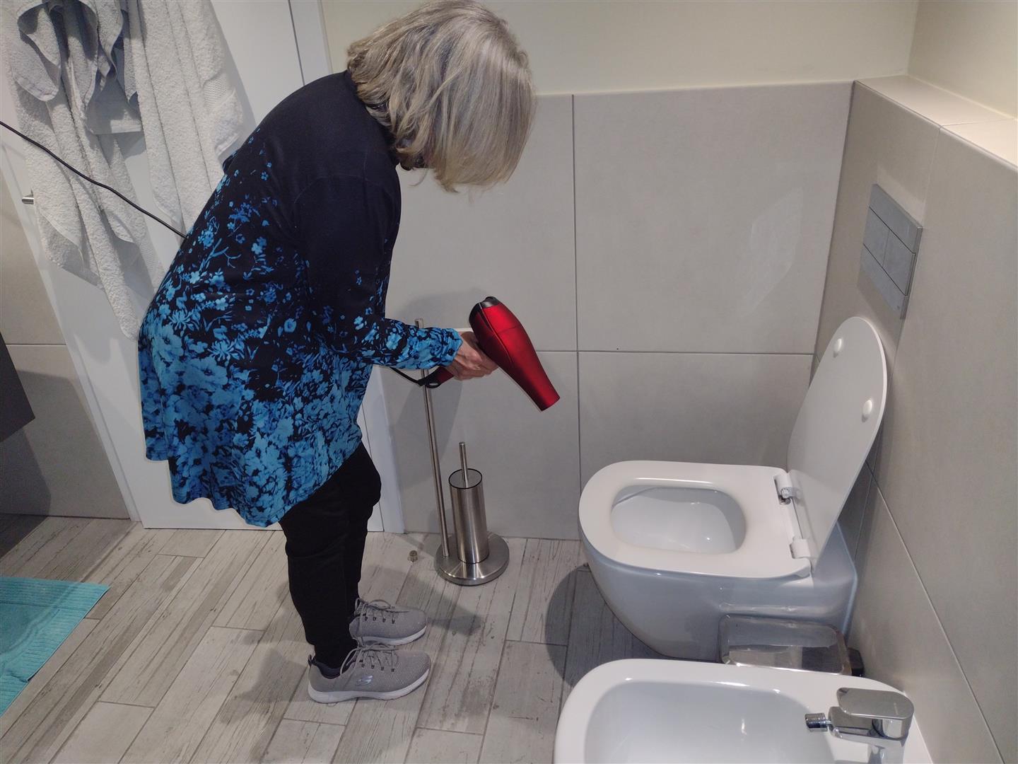 And finally... Very chilly this evening and there is no heat except for a small space heater in the living room. Here's Wendy warming the toilet seat with a hairdryer!!